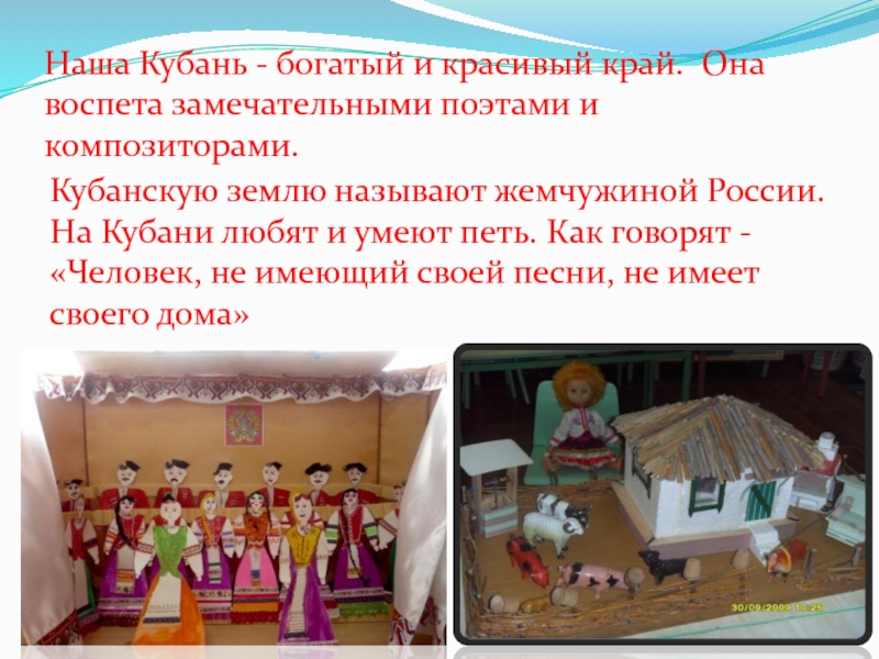 Кубанскую землю называют жемчужиной России. На Кубани любят и умеют петь. Как говорят - «Человек, не имеющий своей песни, не имеет своего дома»