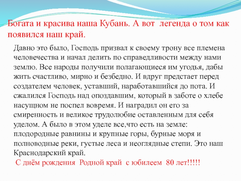 Давно это было, Господь призвал к своему трону все племена человечества и начал делить по справедливости между нами землю. Все народы получили полагающиеся им угодья, дабы жить счастливо, мирно и безбедно. И вдруг предстает перед создателем человек, уставший, наработавшийся до пота. И сжалился Господь над опоздавшим, который в заботе о хлебе насущном не поспел вовремя. И наградил он его за смиренность и великое трудолюбие оставленным для себя уделом. А было в этом уделе все,что есть на земле: плодородные равнины и крупные горы, бурные моря и полноводные реки, густые леса и неоглядные степи. Это наш Краснодарский край.