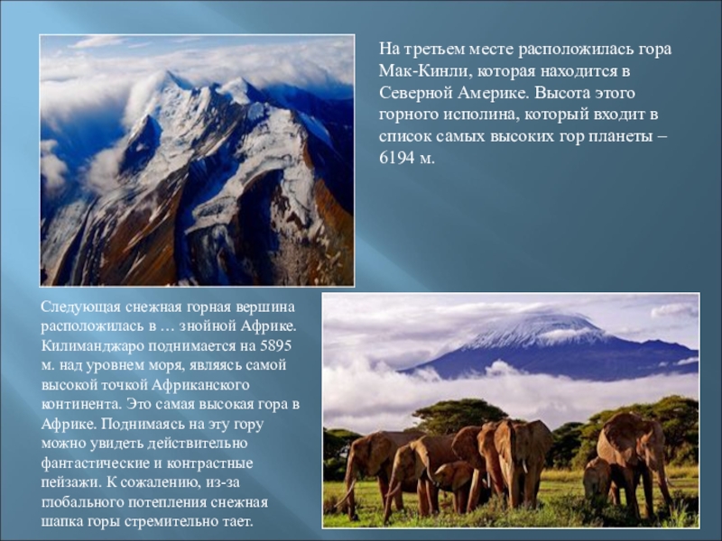 Следующая снежная горная вершина расположилась в … знойной Африке. Килиманджаро поднимается на 5895 м. над уровнем моря, являясь самой высокой точкой Африканского континента. Это самая высокая гора в Африке. Поднимаясь на эту гору можно увидеть действительно фантастические и контрастные пейзажи. К сожалению, из-за глобального потепления снежная шапка горы стремительно тает.