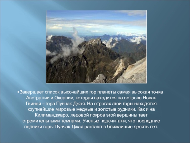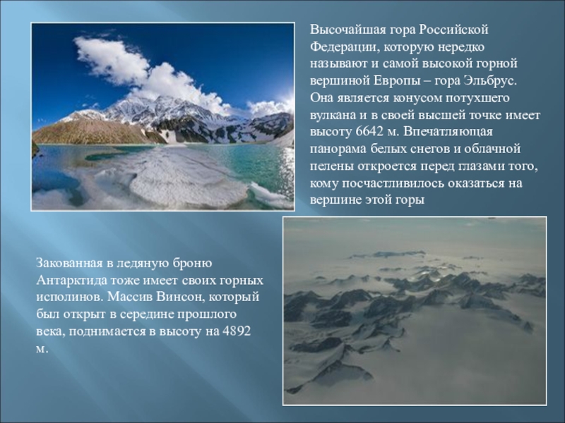Закованная в ледяную броню Антарктида тоже имеет своих горных исполинов. Массив Винсон, который был открыт в середине прошлого века, поднимается в высоту на 4892 м.
