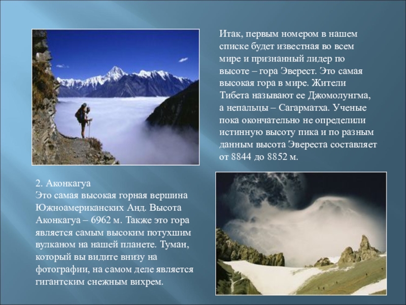 Это самая высокая горная вершина Южноамериканских Анд. Высота Аконкагуа – 6962 м. Также это гора является самым высоким потухшим вулканом на нашей планете. Туман, который вы видите внизу на фотографии, на самом деле является гигантским снежным вихрем.