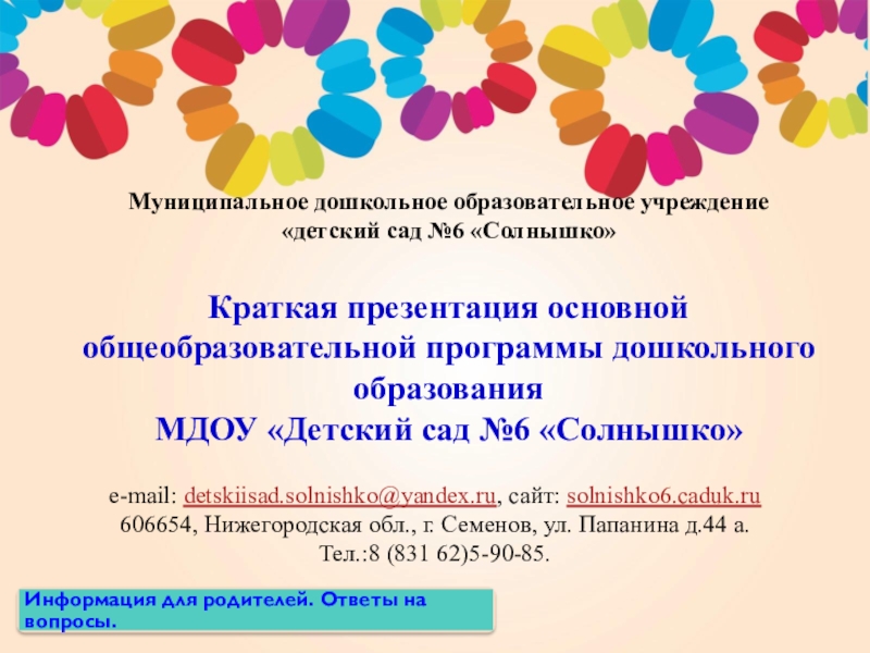 e-mail: detskiisad.solnishko@yandex.ru, сайт: solnishko6.caduk.ru