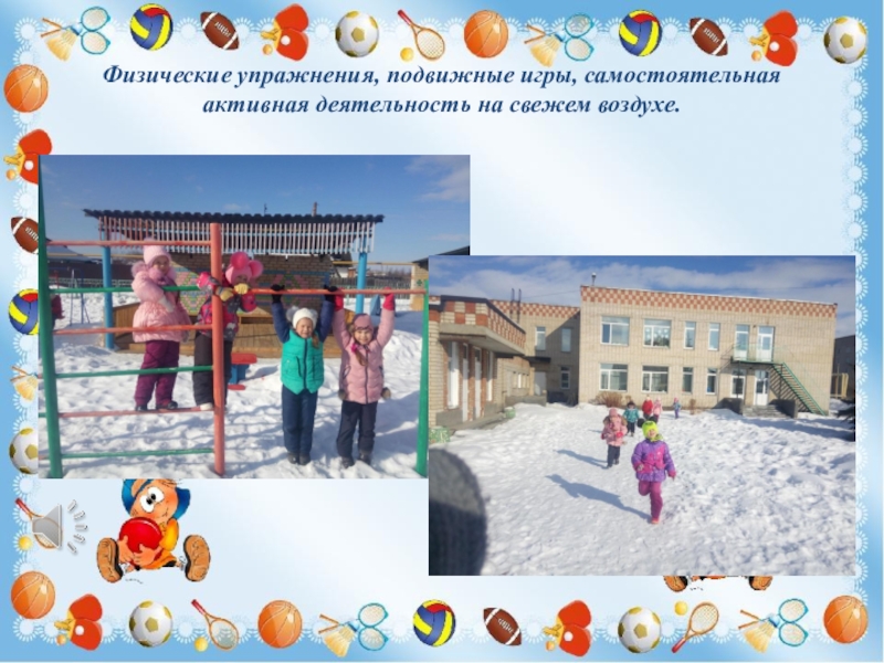 Слайд 9Физические упражнения, подвижные игры, самостоятельная активная деятельность на свежем воздухе.