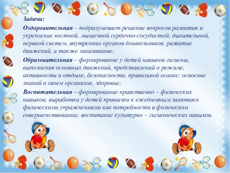 Образовательная – формирование у детей навыков гигиены, выполнения основных движений, представлений о режиме, активности и отдыхе, безопасности, правильной осанке; освоение знаний о своем организме, здоровье;