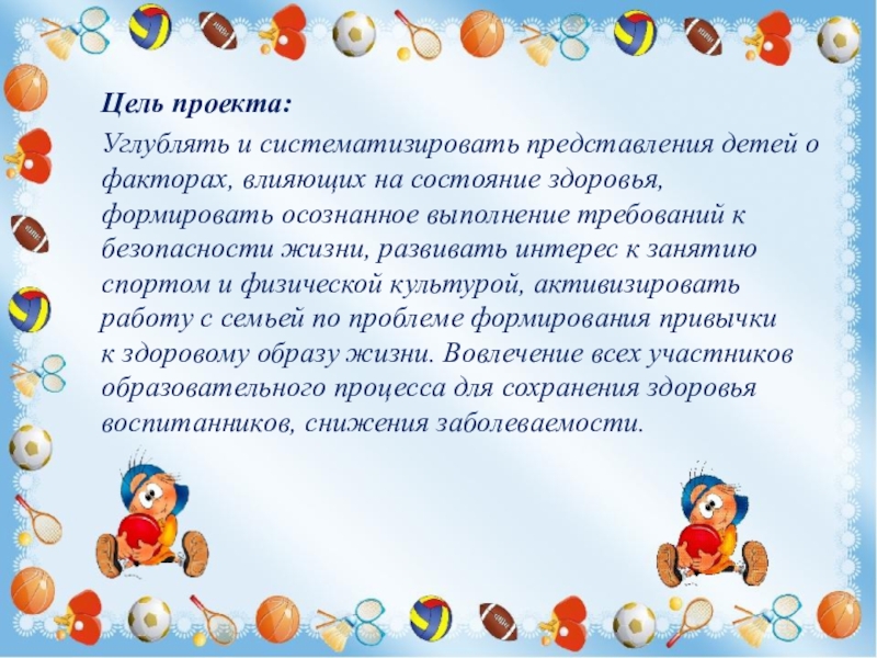 здоровья, формировать осознанное выполнение требований к безопасности жизни, развивать интерес к занятию спортом и физической культурой, активизировать работу с семьей по проблеме формирования привычки к здоровому образу жизни. Вовлечение всех участников образовательного процесса для сохранения здоровья воспитанников, снижения заболеваемости.