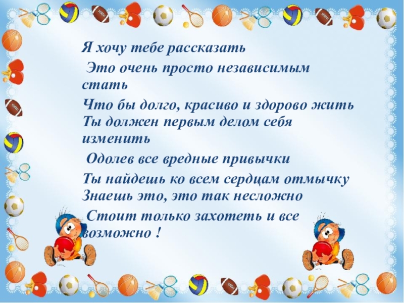 «В мире нет рецепта лучше, Будь со спортом неразлучен. Проживешь