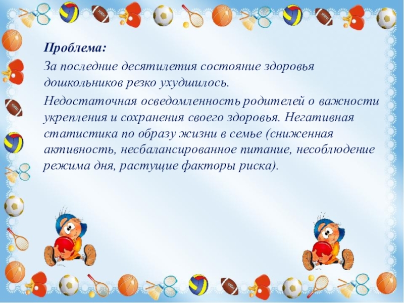 важности укрепления и сохранения своего здоровья. Негативная статистика по образу жизни в семье (сниженная активность, несбалансированное питание, несоблюдение режима дня, растущие факторы риска).