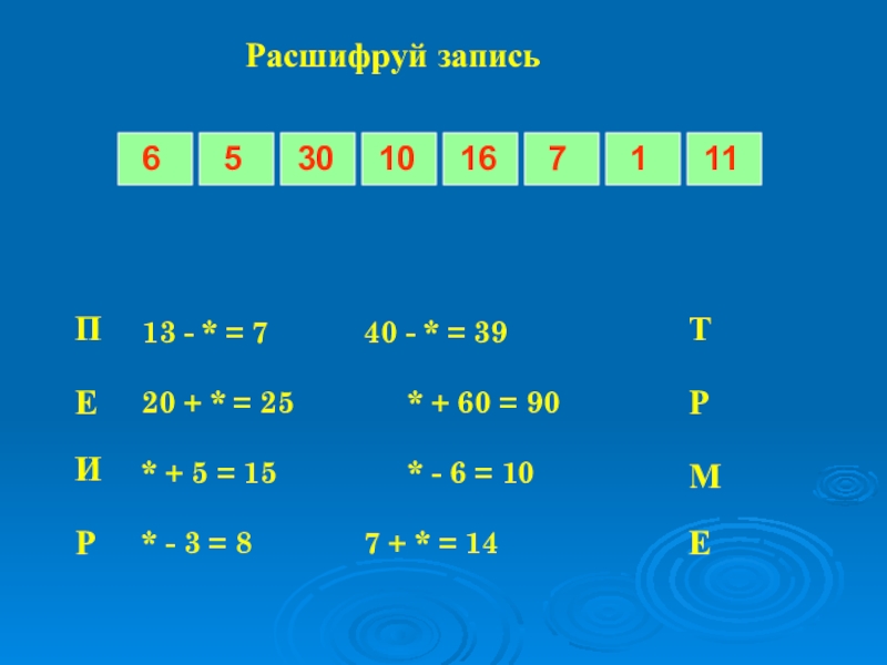 Расшифруй запись13 - * = 7			40 - * = 3920 + * = 25			* + 60 =