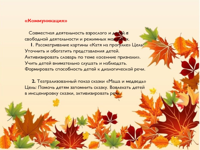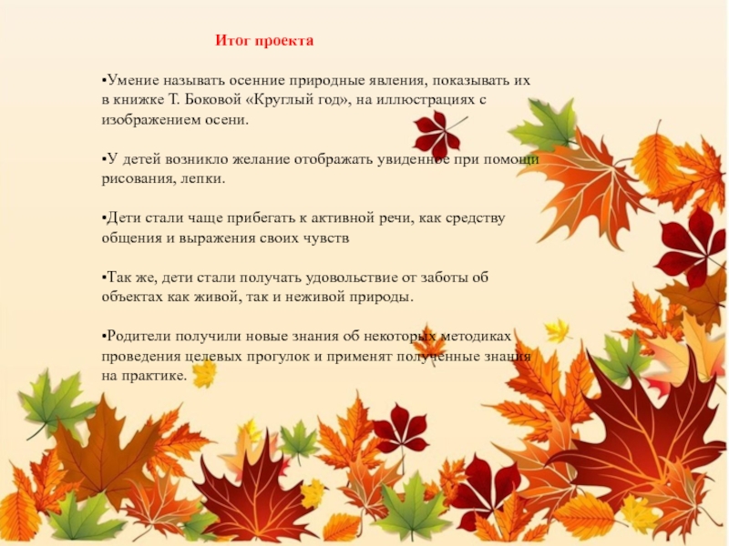 •Умение называть осенние природные явления, показывать их в книжке Т. Боковой «Круглый год», на иллюстрациях с изображением осени.