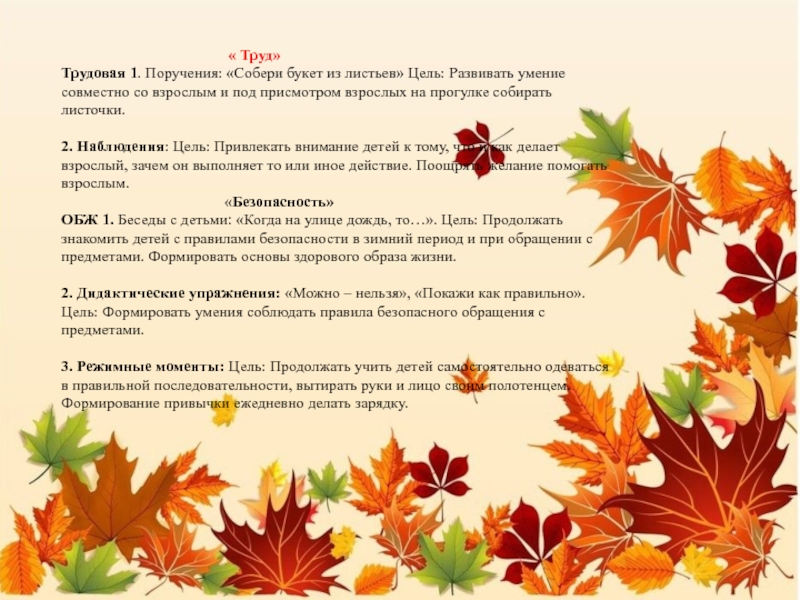 Трудовая 1. Поручения: «Собери букет из листьев» Цель: Развивать умение совместно со взрослым и под присмотром взрослых на прогулке собирать листочки.