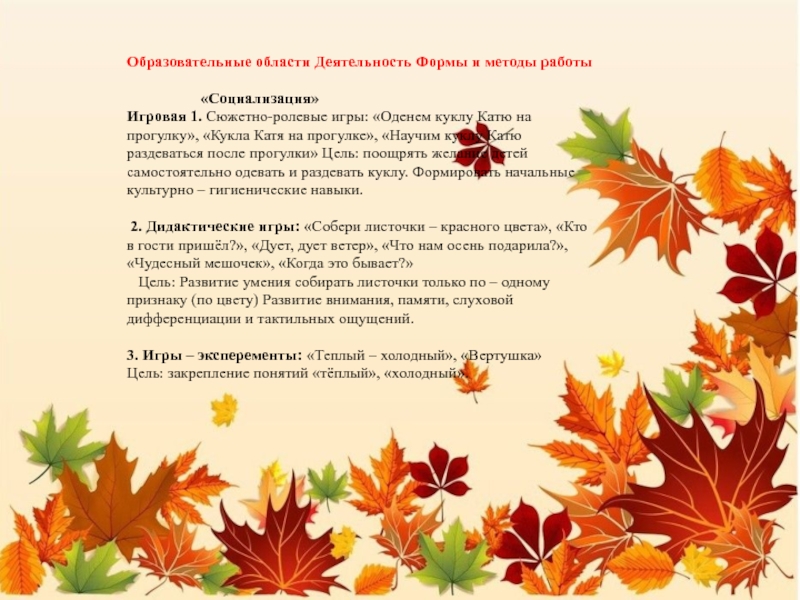2. Дидактические игры: «Собери листочки – красного цвета», «Кто в гости пришёл?», «Дует, дует ветер», «Что нам осень подарила?», «Чудесный мешочек», «Когда это бывает?»
