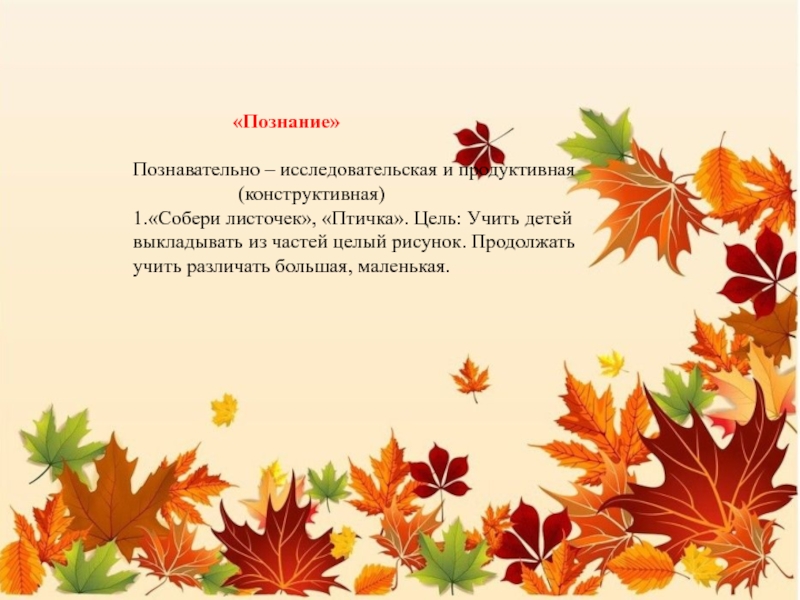 1.«Собери листочек», «Птичка». Цель: Учить детей выкладывать из частей целый рисунок. Продолжать учить различать большая, маленькая.