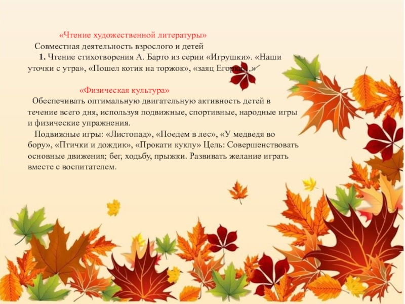1. Чтение стихотворения А. Барто из серии «Игрушки». «Наши уточки с утра», «Пошел котик на торжок», «заяц Егорка…»