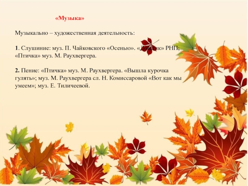 1. Слушиние: муз. П. Чайковского «Осенью». «Дождик» РНП; «Птичка» муз. М. Раухвергера.