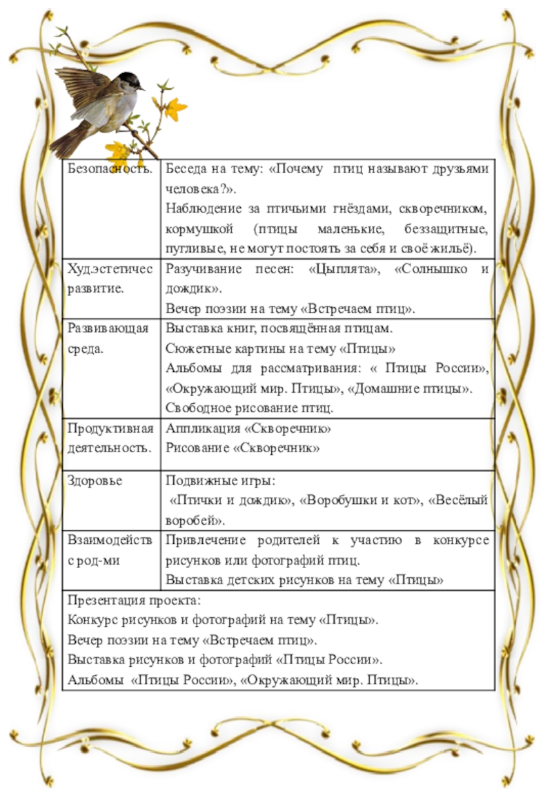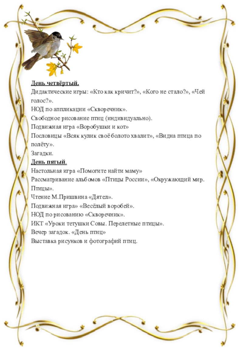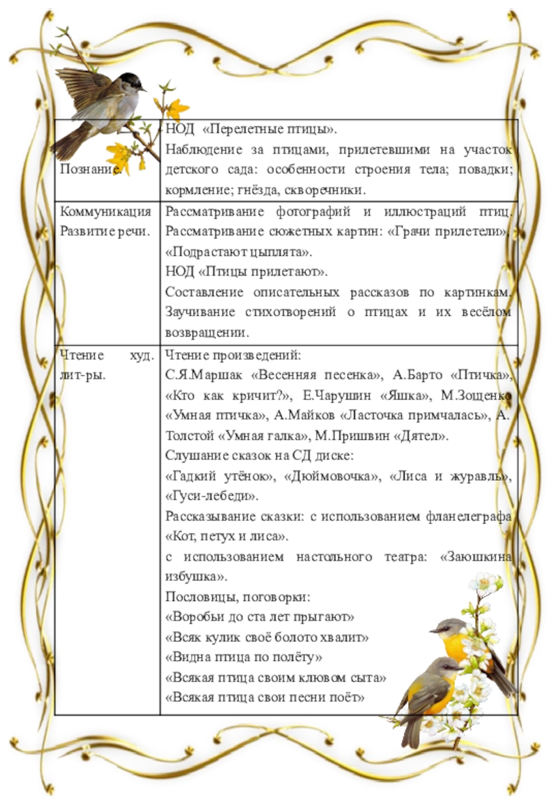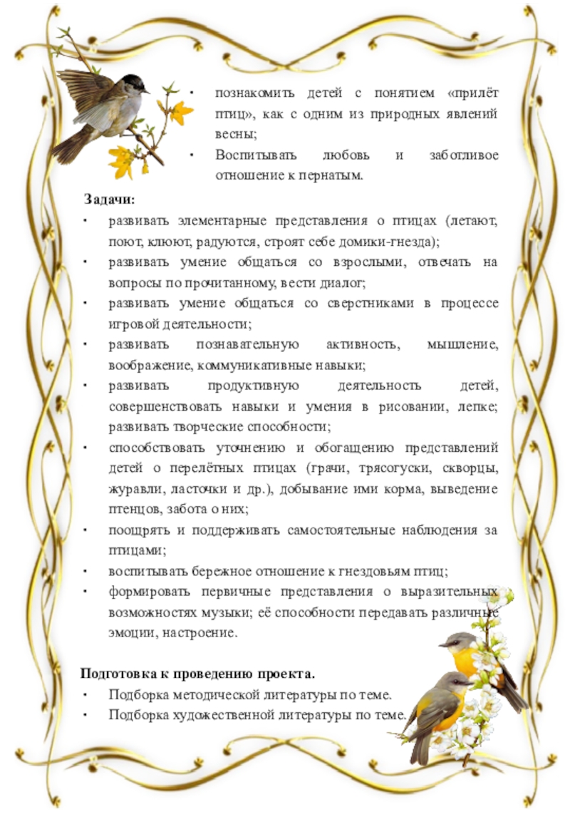 способствовать уточнению и обогащению представлений детей о перелётных птицах (грачи, трясогуски, скворцы, журавли, ласточки и др.), добывание ими корма, выведение птенцов, забота о них;