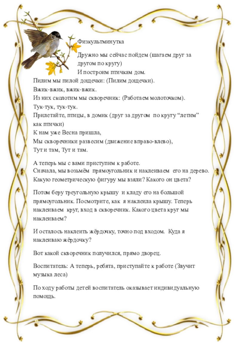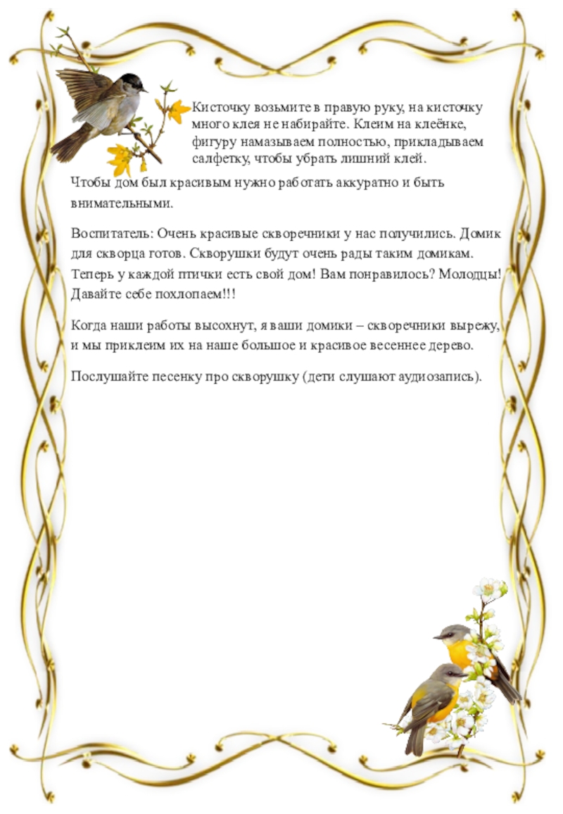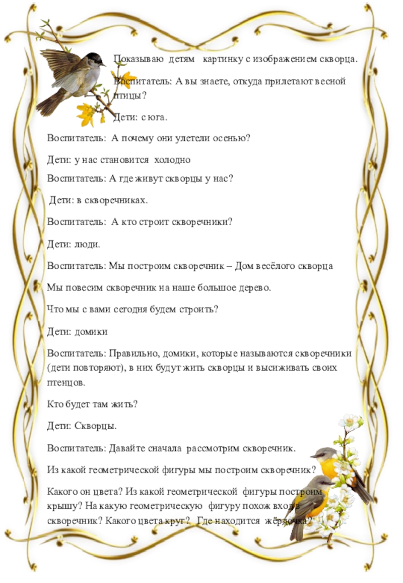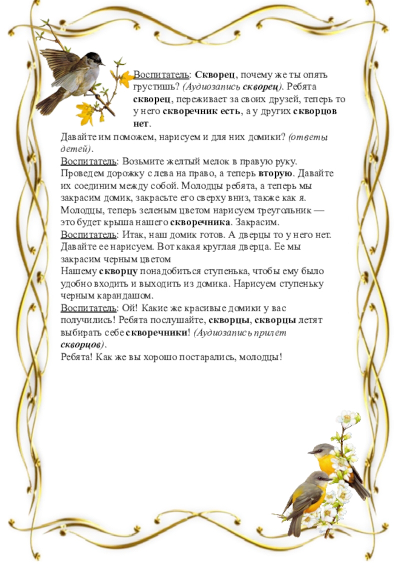 Воспитатель: Правильно, домики, которые называются скворечники (дети повторяют), в них будут жить скворцы и высиживать своих птенцов.