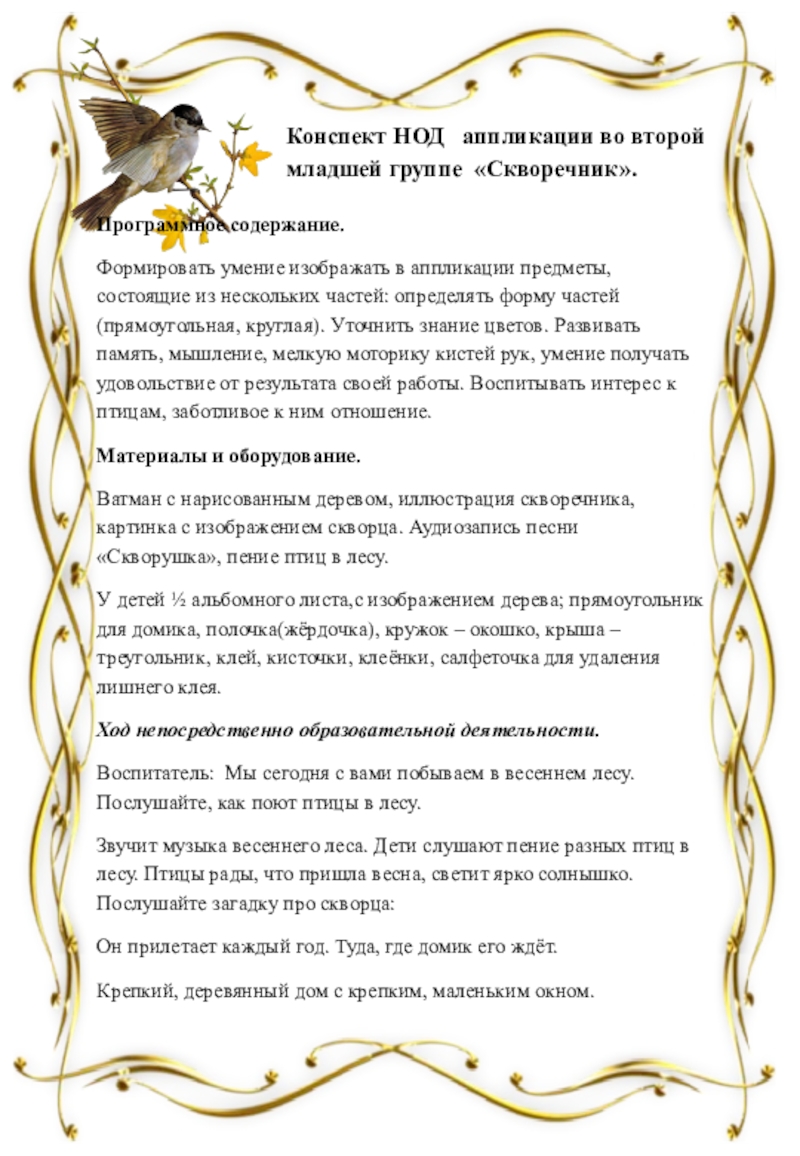 Конспект НОД аппликации во второй младшей группе «Скворечник».