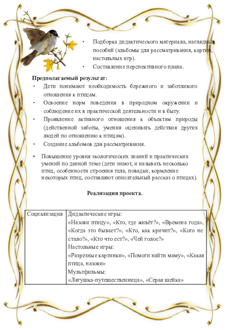 Повышение уровня экологических знаний и практических умений по данной теме (дети знают, и называть несколько птиц, особенности строения тела, повадки, кормление некоторых птиц, составляют описательный рассказ о птицах).