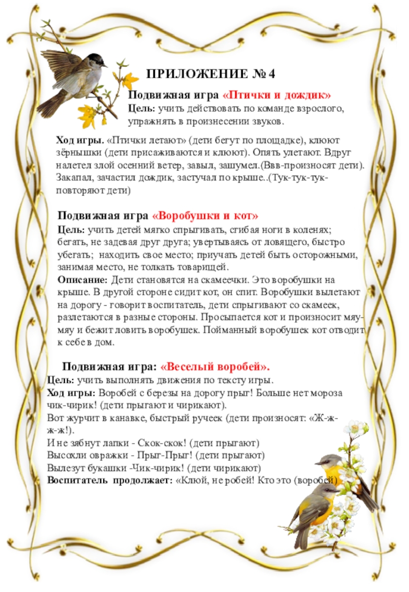 Ход игры: Воробей с березы на дорогу прыг! Больше нет мороза чик-чирик! (дети прыгают и чирикают).