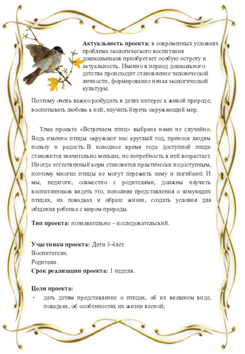 Актуальность проекта: в современных условиях проблема экологического воспитания дошкольников приобретает особую остроту и актуальность. Именно в период дошкольного детства происходит становление человеческой личности, формирование начал экологической культуры.