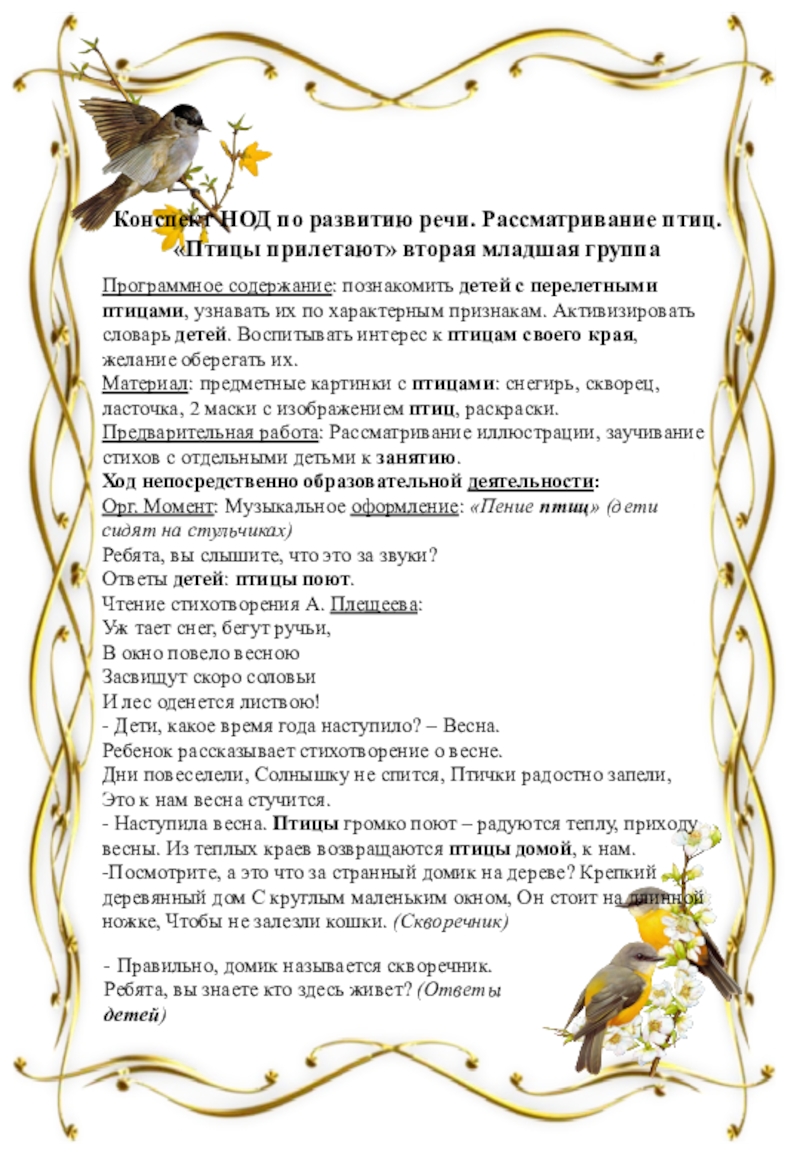 дать детям представление о птицах, об их внешнем виде, повадках, об особенностях их жизни весной;