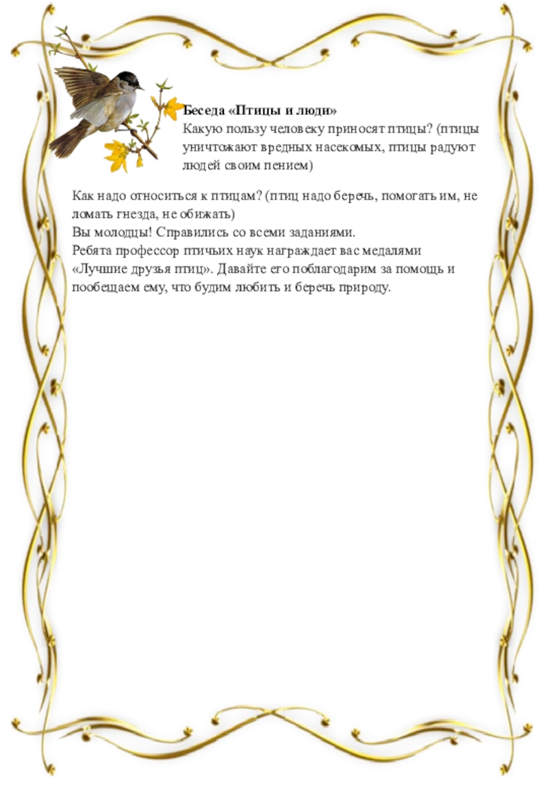 Ребята профессор птичьих наук награждает вас медалями «Лучшие друзья птиц». Давайте его поблагодарим за помощь и пообещаем ему, что будим любить и беречь природу.