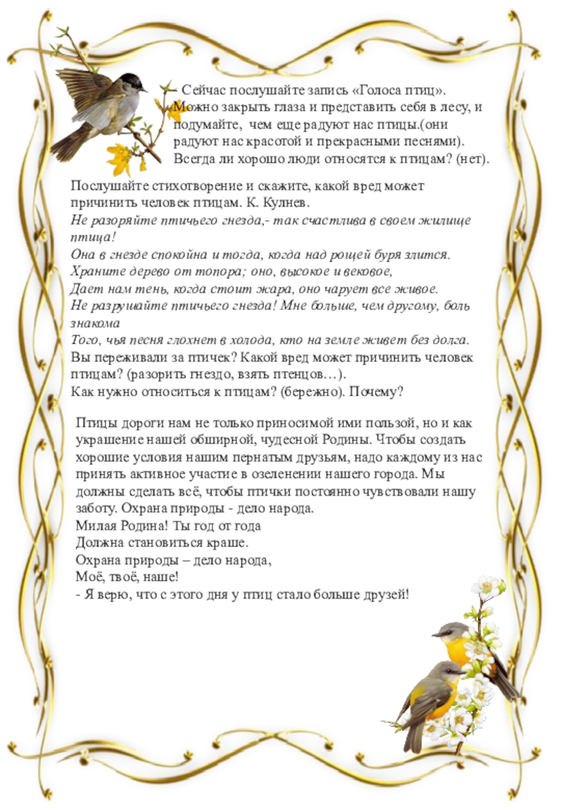 Послушайте стихотворение и скажите, какой вред может причинить человек птицам. К. Кулнев.