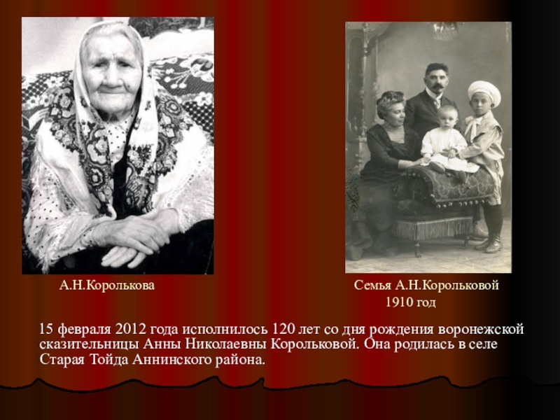 15 февраля 2012 года исполнилось 120 лет со дня рождения воронежской сказительницы Анны Николаевны Корольковой. Она родилась в селе Старая Тойда Аннинского района.