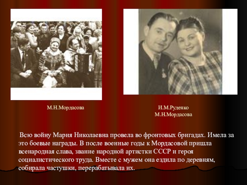 Всю войну Мария Николаевна провела во фронтовых бригадах. Имела за это боевые награды. В после военные годы к Мордасовой пришла всенародная слава, звание народной артистки СССР и героя социалистического труда. Вместе с мужем она ездила по деревням, собирала частушки, перерабатывала их.