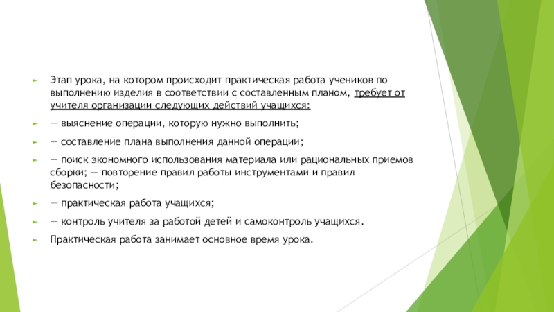Слайд 7Этап урока, на котором происходит практическая работа учеников по выполнению изделия