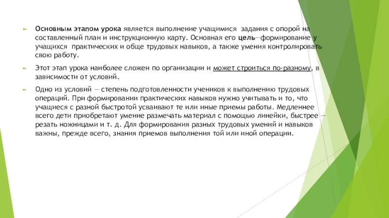 Одно из условий — степень подготовленности учеников к выполнению трудовых операций. При формировании практических навыков нужно учитывать и то, что учащиеся с разной быстротой усваивают те или иные приемы работы. Медленнее всего дети приобретают умение размечать материал с помощью линейки, быстрее — резать ножницами и т. д. Для формирования разных трудовых умений и навыков важны, прежде всего, знания приемов выполнения той или иной операции.