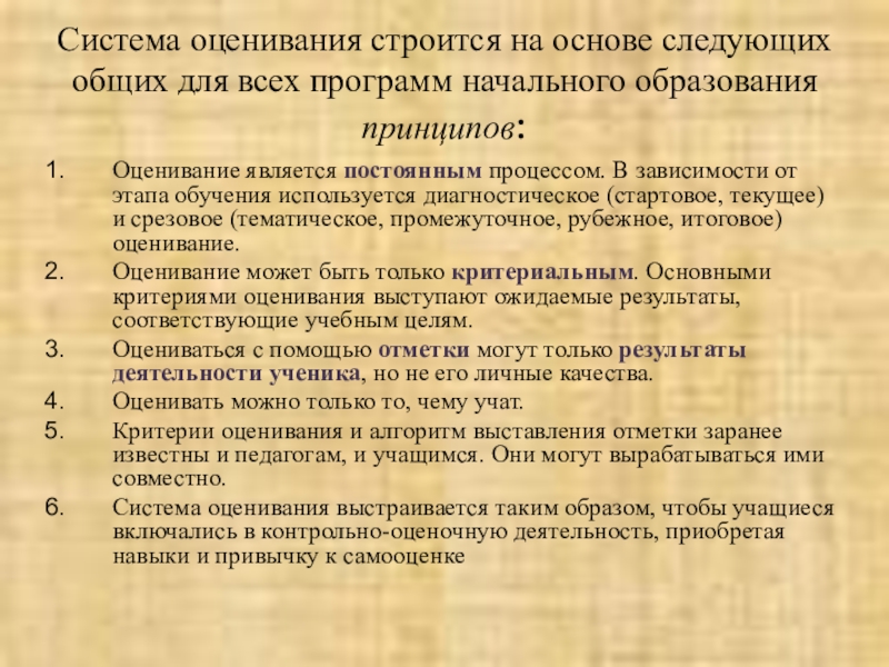 Система оценивания выстраивается таким образом, чтобы учащиеся включались в контрольно-оценочную деятельность, приобретая навыки и привычку к самооценке