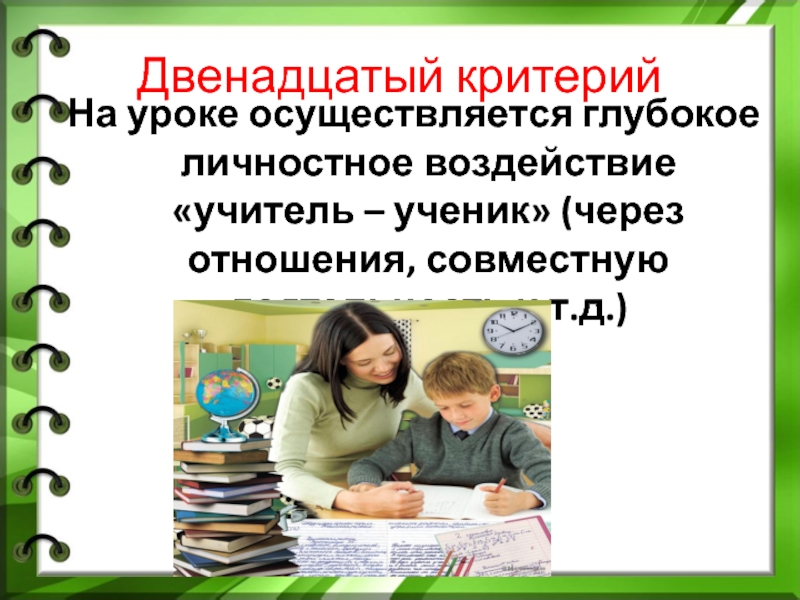 Двенадцатый критерий На уроке осуществляется глубокое личностное воздействие «учитель – ученик» (через отношения, совместную деятельность и т.д.)