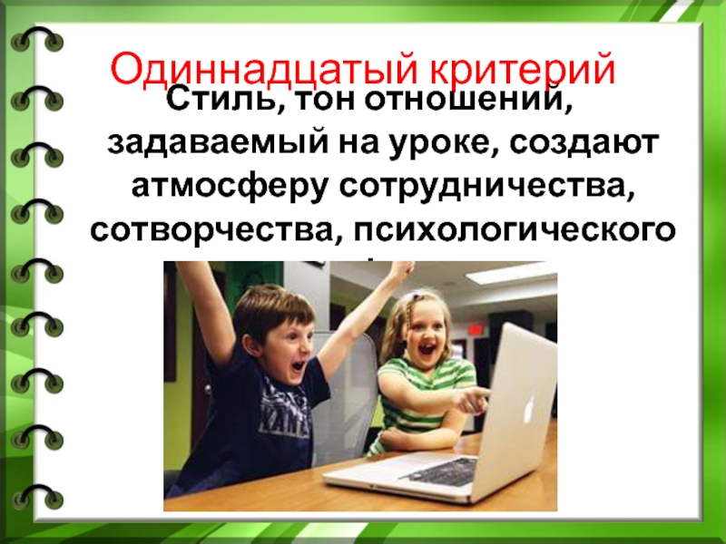 Одиннадцатый критерийСтиль, тон отношений, задаваемый на уроке, создают атмосферу сотрудничества, сотворчества, психологического комфорта.