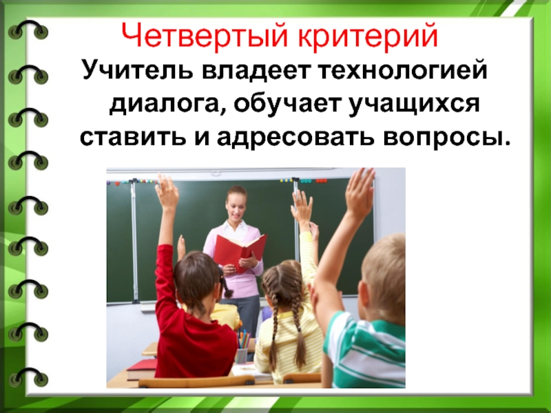 Четвертый критерийУчитель владеет технологией диалога, обучает учащихся ставить и адресовать вопросы.