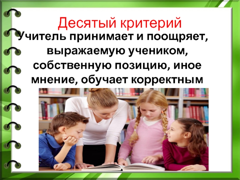 Десятый критерийУчитель принимает и поощряет, выражаемую учеником, собственную позицию, иное мнение, обучает корректным формам их выражения.