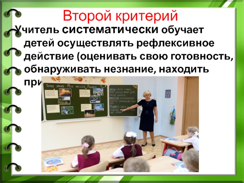 Второй критерийУчитель систематически обучает детей осуществлять рефлексивное действие (оценивать свою готовность, обнаруживать незнание, находить причины затруднений