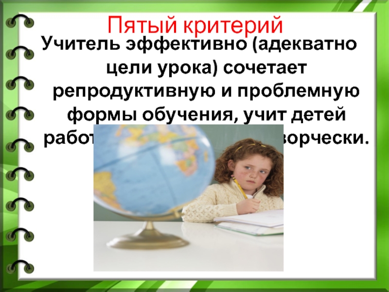 Пятый критерийУчитель эффективно (адекватно цели урока) сочетает репродуктивную и проблемную формы обучения, учит детей работать по правилу