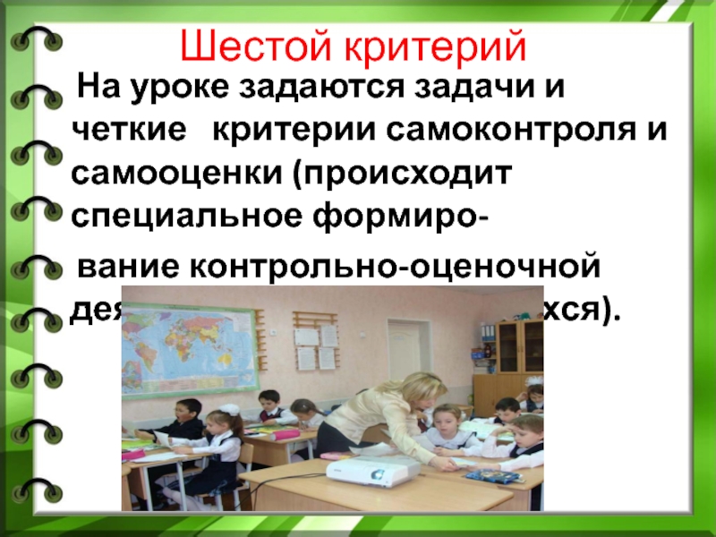 Шестой критерий  На уроке задаются задачи и четкие  критерии самоконтроля и самооценки (происходит специальное формиро-
