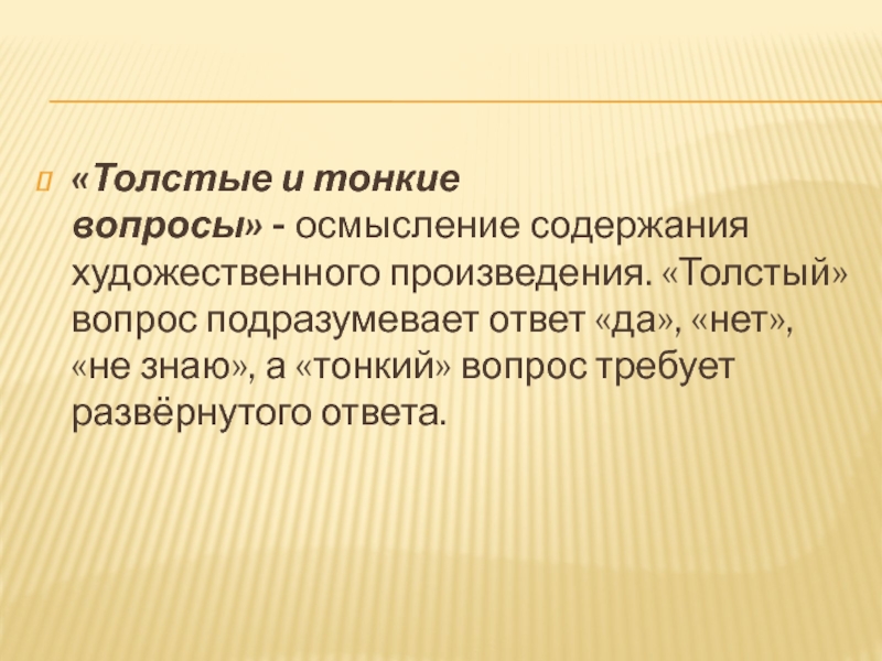 Слайд 11«Толстые и тонкие вопросы» - осмысление содержания художественного произведения. «Толстый» вопрос подразумевает ответ