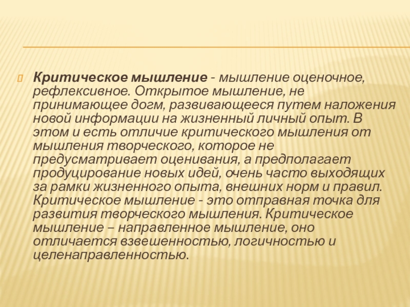 Слайд 2Критическое мышление - мышление оценочное, рефлексивное. Открытое мышление, не принимающее догм, развивающееся
