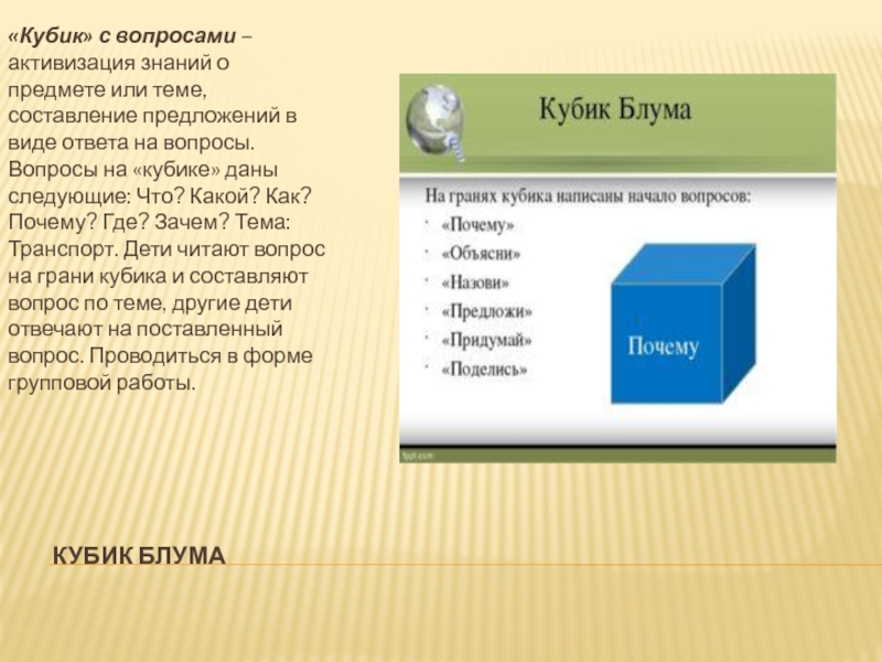 предложений в виде ответа на вопросы. Вопросы на «кубике» даны следующие: Что? Какой? Как? Почему? Где? Зачем? Тема: Транспорт. Дети читают вопрос на грани кубика и составляют вопрос по теме, другие дети отвечают на поставленный вопрос. Проводиться в форме групповой работы.