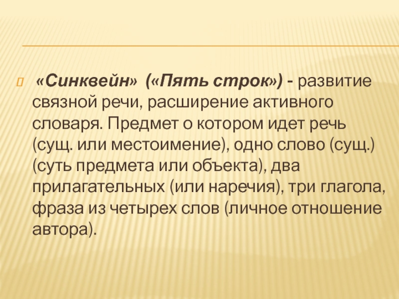 Слайд 6 «Синквейн» («Пять строк») - развитие связной речи, расширение активного словаря. Предмет о котором