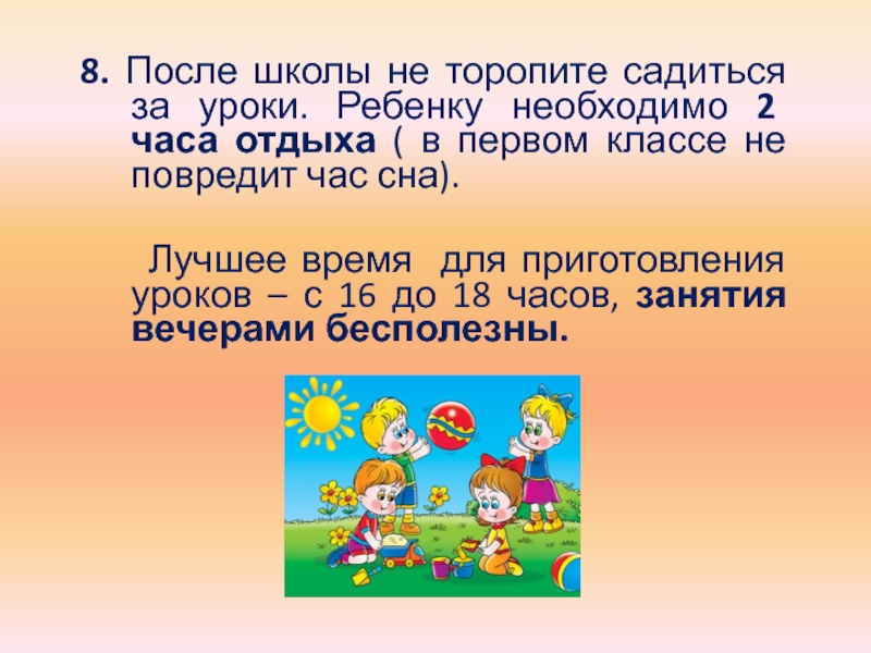 Слайд 298. После школы не торопите садиться за уроки. Ребенку необходимо 2