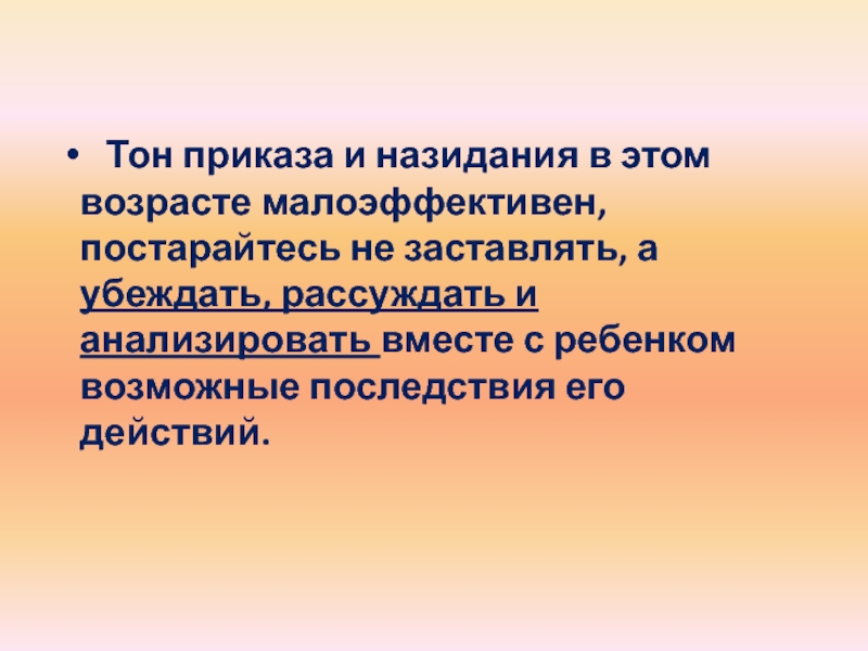 Слайд 12 Тон приказа и назидания в этом возрасте малоэффективен, постарайтесь