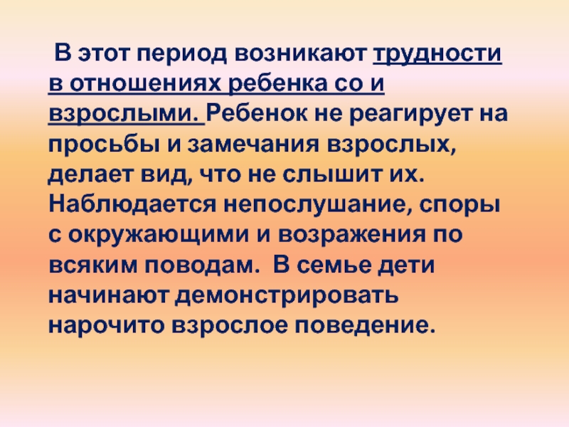 взрослыми. Ребенок не реагирует на просьбы и замечания взрослых, делает вид, что не слышит их. Наблюдается непослушание, споры с окружающими и возражения по всяким поводам. В семье дети начинают демонстрировать нарочито взрослое поведение.