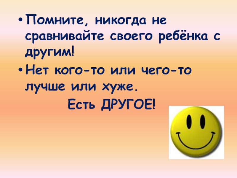 Слайд 30Помните, никогда не сравнивайте своего ребёнка с другим!