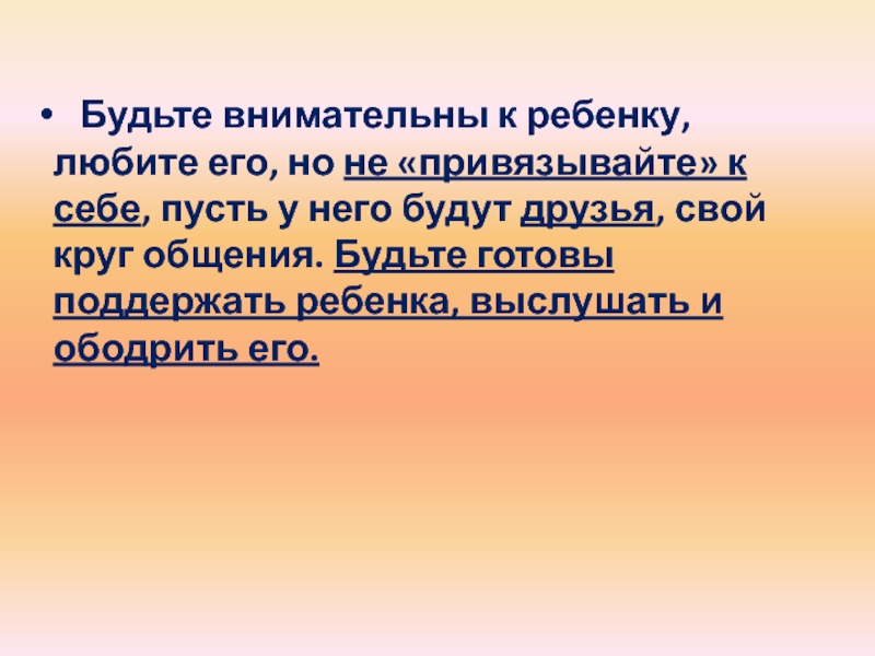Слайд 10 Будьте внимательны к ребенку, любите его, но не «привязывайте»