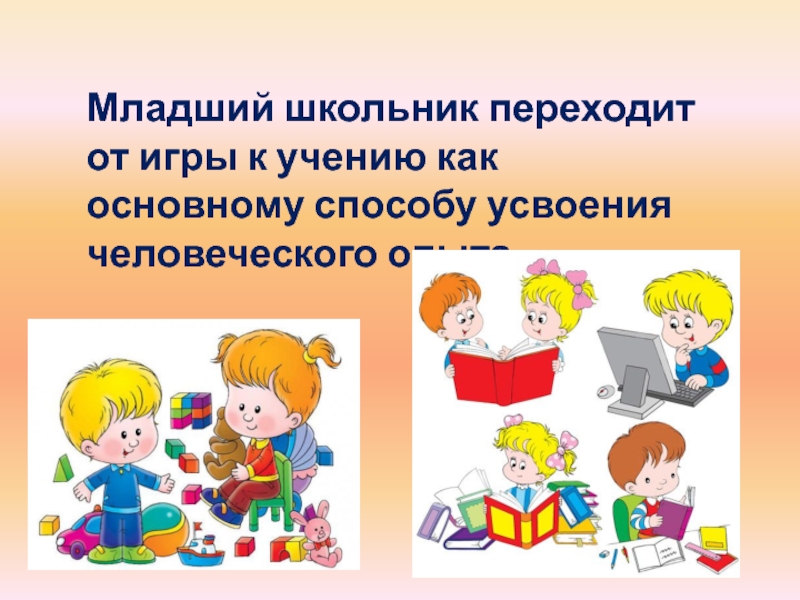 Слайд 4Младший школьник переходит от игры к учению как основному способу усвоения