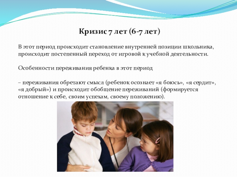 Кризис 7 лет (6-7 лет)В этот период происходит становление внутренней позиции школьника, происходит постепенный переход от игровой